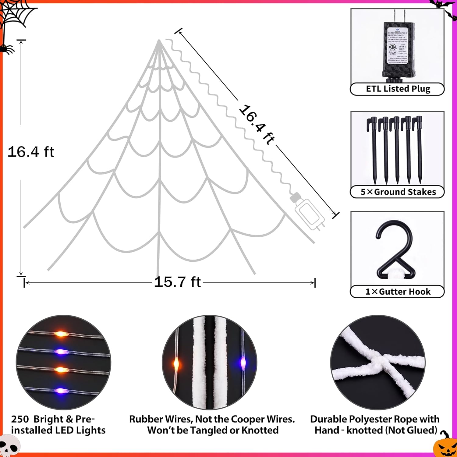 🎃 Jumbo Halloween Spider Web Lights: Create a spooky yard centerpiece with our 250 LED giant spider web (16.4ft L x 15.7ft W). Crafted from thick, hand-knotted polyester rope (not glued), it’s sturdy enough to hold a large spider prop. Easy to set up in minutes without tangling, making your Halloween decorating stress-free.