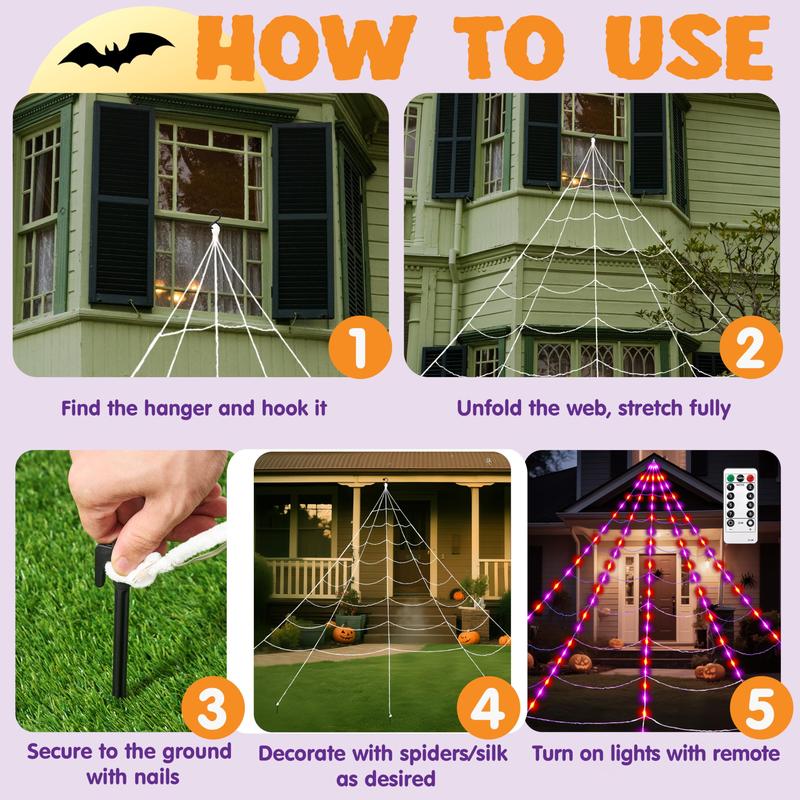 💡 Safe & IP65 Waterproof: Featuring a 3.5V low voltage design, these spider web lights are safe to touch and energy-efficient. With IP65 waterproof protection, they withstand rain and harsh outdoor conditions, ensuring long-lasting Halloween fun indoors or outdoors.