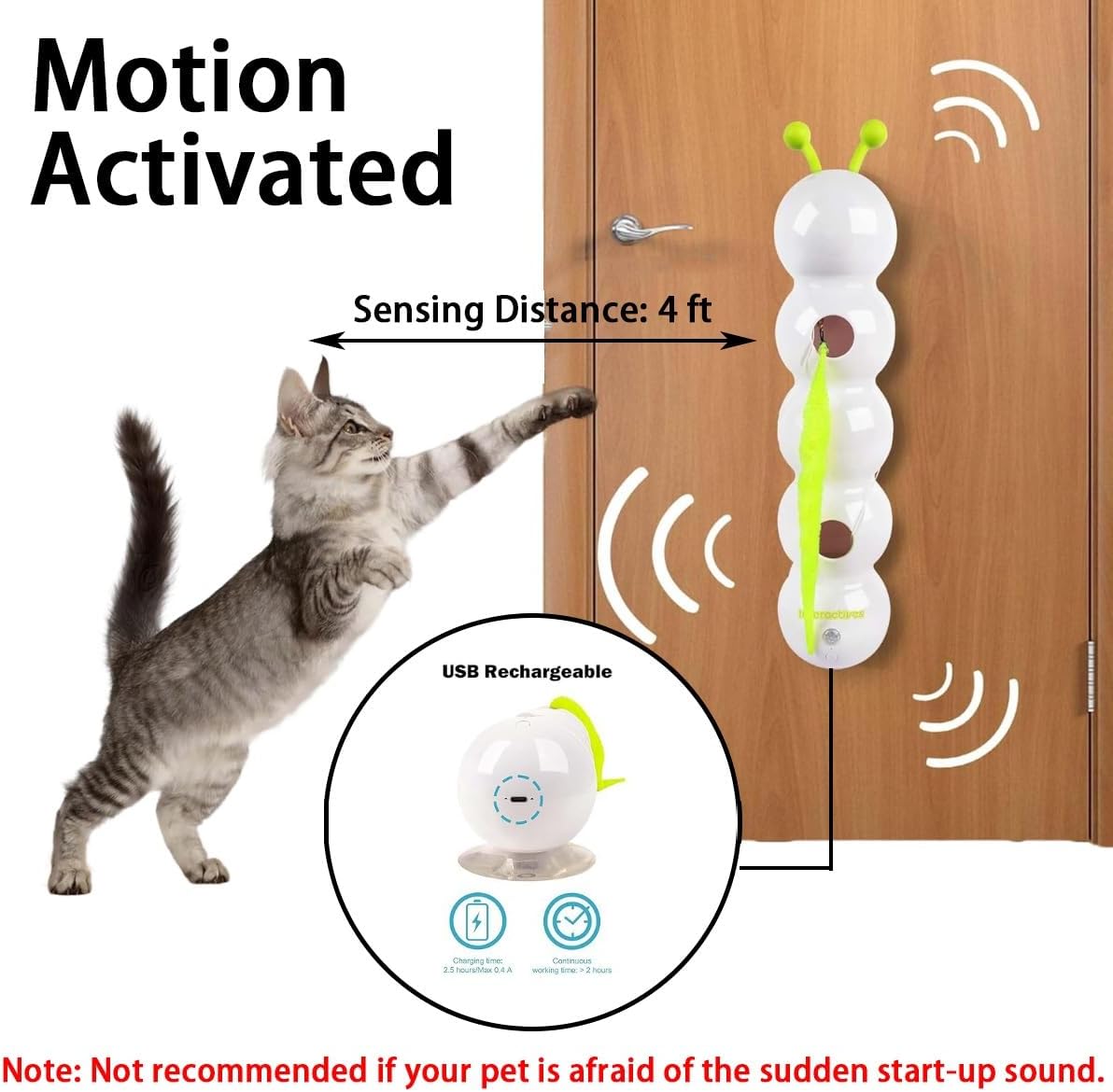 Motion-Activated Excitement: Equipped with a smart motion sensor, this toy activates when your cat approaches, offering a hands-free play experience. With a 4 ft sensing range, it’s ideal for indoor cats. Note: Not suitable for pets sensitive to sudden sounds